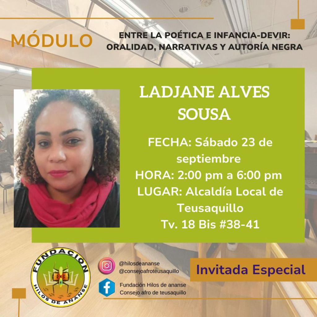 Através de suas atuações profissional e acadêmica na área da educação, Ladjane foi convidada pela Fundação Hilos de Ananse, o Conselho Afrodescendente de Teusaquillo e a ACDI/VOCA para ministrar a oficina pedagógica “entre poética e infância – Devir: oralidade, narrativas e autoria negra”. A oficina ocorreu neste último final de semana, sábado 23/09 na Colômbia, onde Ladjane partilhou seus conhecimentos sobre a literatura e poesia infantil afro-brasileiras, provocando reflexões sobre as práticas culturais afrodescendentes.
