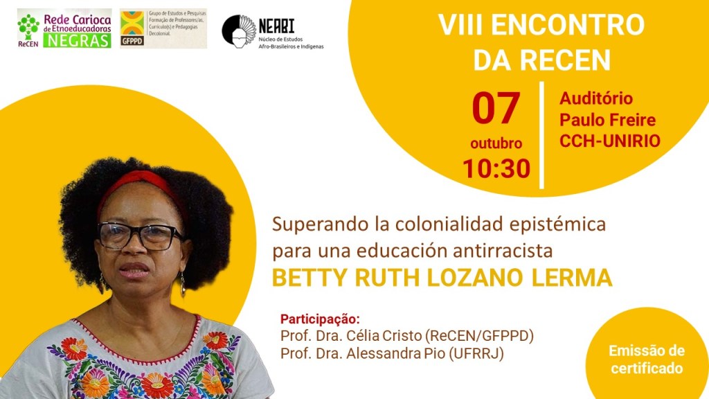 A intelectual-ativista afro-colombiana Profª Dra. Betty Ruth Lozano Lerma abrilhantará nosso VIII ENCONTRO DA REDE CARIOCA DE ETNOEDUCADORAS NEGRAS fortalecendo nossas bases epistemológicas, trocando conhecimentos em REDES COLABORATIVAS!